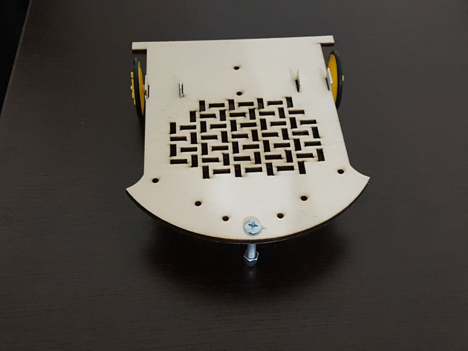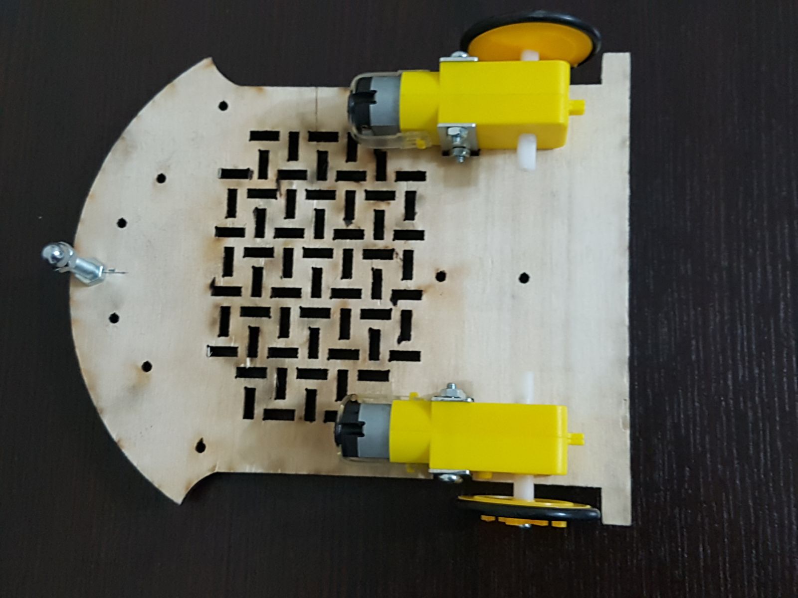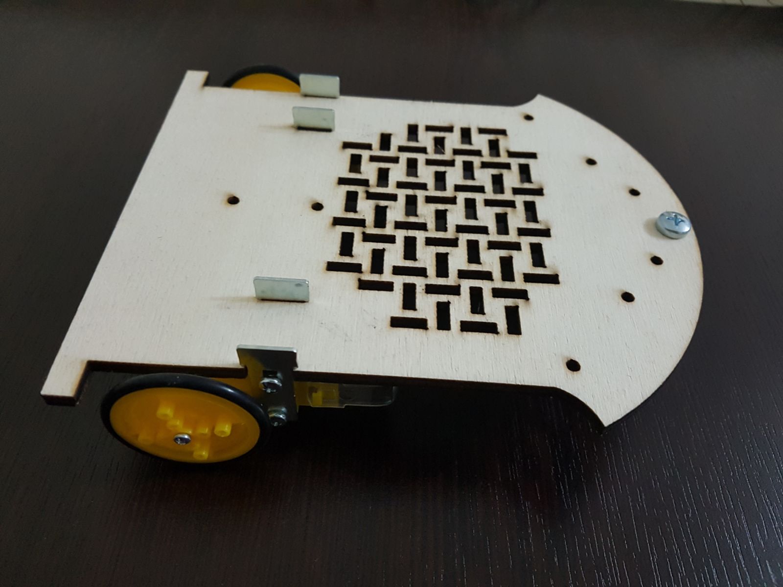 Ahşap cnc lazer ile kesilmiş çok amaçlı robot şasesidir. Motorlar özel üretilmiş metal aparatlar ile gövdeye montaj yapılmaktadır. Desenli delik alan bir çok kart metrik 3 vida ile tutturulacak şekilde dizayn edilmiştir. Ön tarafa ultrasonik sensör tutturmak için üç farklı açıda montaj delikleri açılmıştır. Engelden kaçan ve labirent robotlar için rahatlıkla kullanılabilecek yapıdadır. 14 x 17 cm boyutlarındadır. Ön destek noktası metrik 5 kapalı somunlu vida ile yapılmıştır. İlköğretim seviyesi öğrencilerin rahatlıkla yapabileceği bir şasedir. Bizim robot kontrol kartlarımız ile birlikte kullanarak çok kolay robotlar yapabilirsiniz.