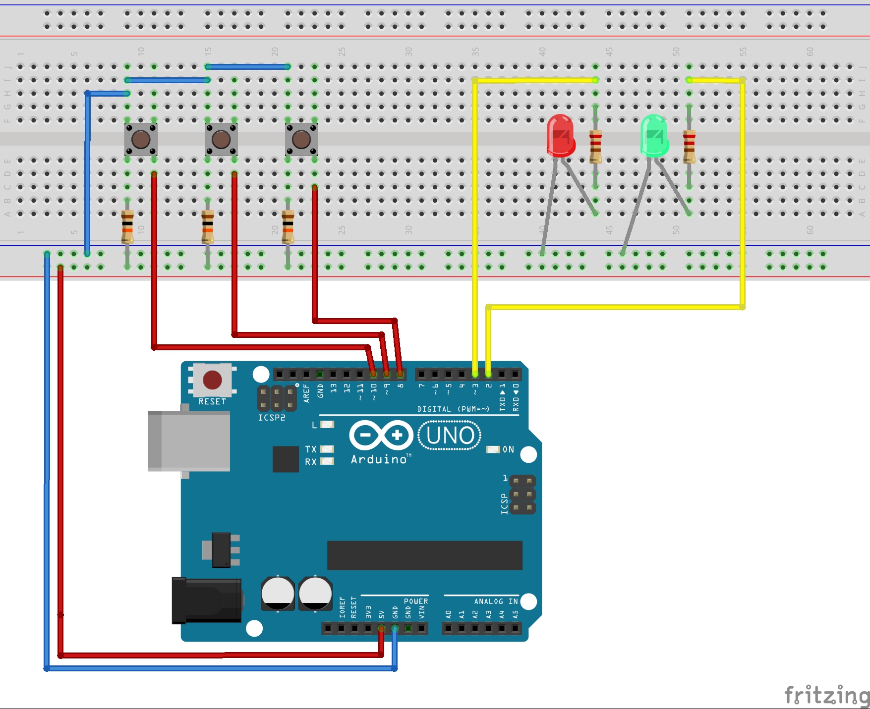 3 butona doğru sırayla basılmadığında kırmızı ledi yakar. Sayac değişkeni herhangi bir butona basıldığında 1 artacaktır. Sayac=3 olunca kırmızı ya da yeşil led yanar ve program başa döner. Her buton kontrolünden sonra delay komutu kullanıldığına dikkat ediniz. Buton arkı söndürme işlemi denen bu olay çok önemlidir. Kulanılmadığında özellikle sayaç olarak kullanılan işlemlerde butona her basışta değerin birer birer artması gerekirken üçer beşer artacaktır. Değişken kullanımını ve if komutunu öğrenmek için iyi bir çalışmadır.