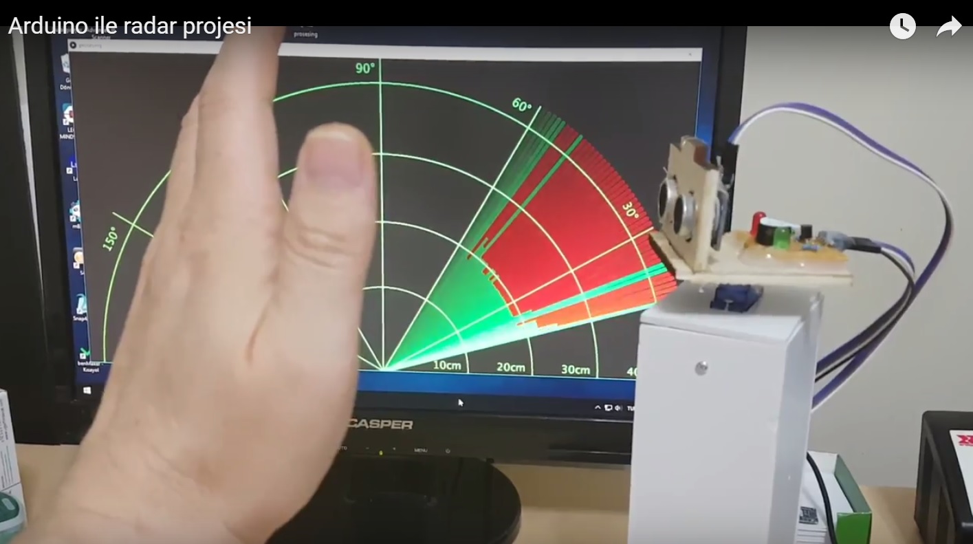 Arduino ve HCSR04 ultrasonic sensör ile yapılan radar projemizdir. Web de bir çok örneği mevcuttur. Arduino kodları için tıklayın.